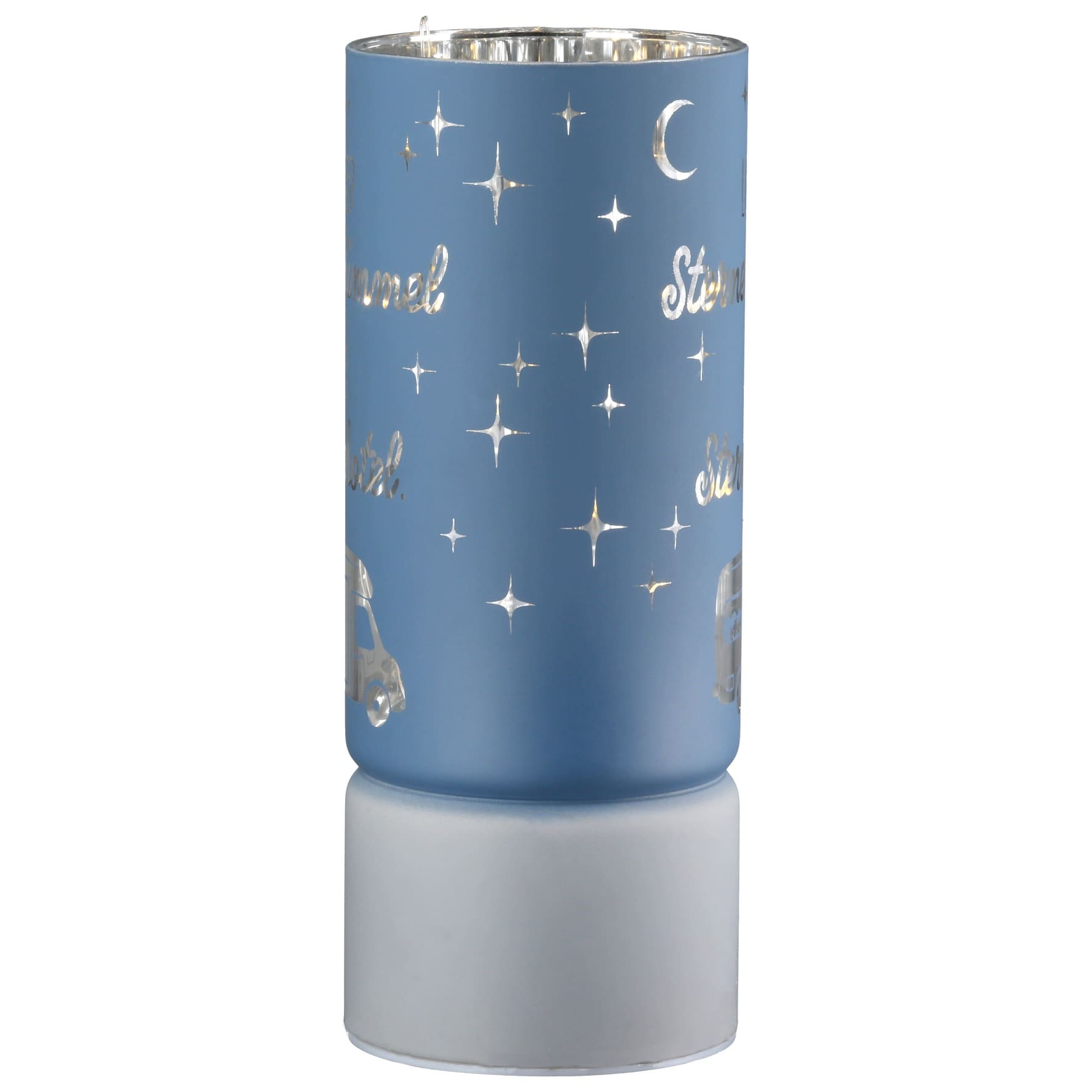 Das Gilde Windlicht „Camperglück“ in Blau mit grauem Fuß ist die perfekte stimmungsvolle Beleuchtung für Camper und Naturfreunde. Das zylindrische Windlicht aus Glas lässt das Licht durch den Camper, den Spruch „Lieber Sternenhimmel als Sternehotel“ sowie Sterne und einen Mond hindurchscheinen – ideal für eine entspannte Atmosphäre, die an den freien Himmel und den Campingurlaub erinnert. Im Inneren befindet sich eine Lichterkette, die für eine sanfte und gemütliche Beleuchtung sorgt. Dieses Windlicht wird mit 3 x AAA-Batterien betrieben (nicht im Lieferumfang enthalten) und verfügt über eine praktische Timerfunktion, die das Licht automatisch ein- und ausschaltet. Mit einer Höhe von 15 cm und einem Durchmesser von 7 cm eignet es sich hervorragend für den Innenbereich, die Terrasse oder den Campingplatz.