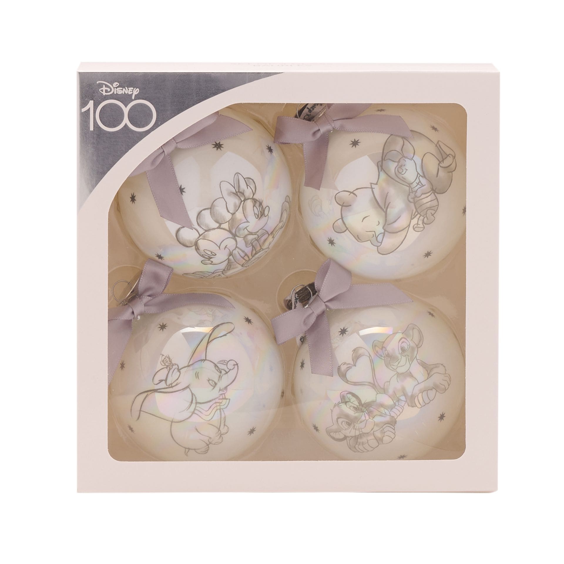 Feiern Sie das hundertjährige Jubiläum von Disney mit diesem zauberhaften Set aus 4 klassischen Weihnachtskugeln, die die wahre Magie von Disney und die Themen der Liebe widerspiegeln. Jede Kugel zeigt ein bezauberndes Bild von Disney-Lieblingen, die für ihre unvergängliche Freundschaft und Zuneigung bekannt sind. Die weißen Acrylkugeln haben eine glänzende Oberfläche, die im Licht schillernde Regenbogenreflexe zeigt und das Dekor mit einem festlichen Glanz veredelt. Die Kugeln sind mit einer grauen Schleife und einem Band verziert, die den liebevollen Charakter der Weihnachtszeit noch unterstreichen.