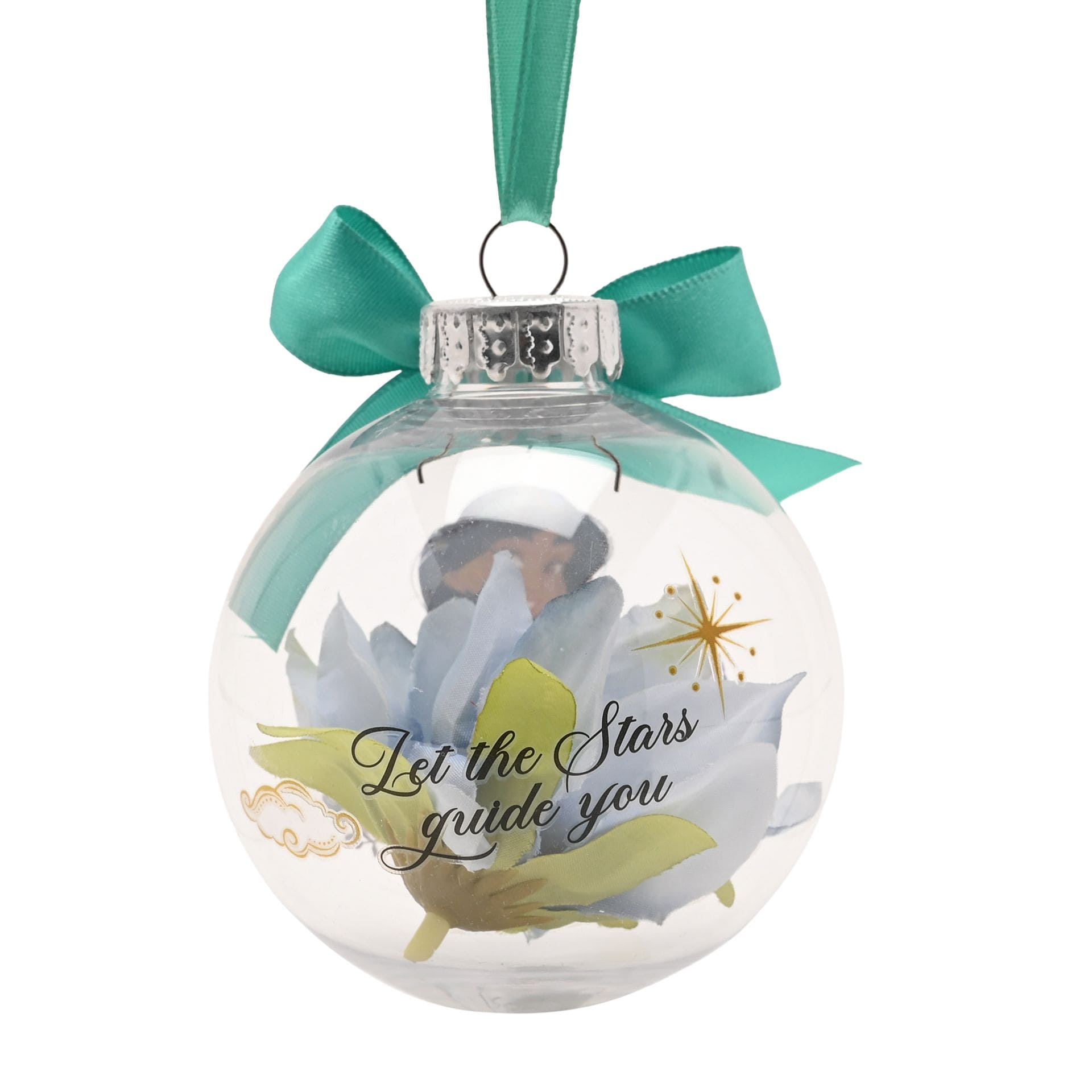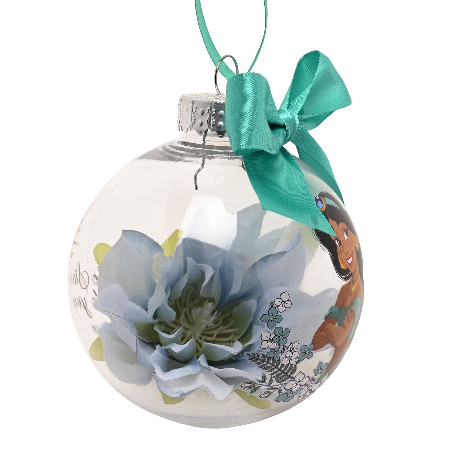 Tauche ein in die Welt von 1001 Nacht. Diese bezaubernde Disney Weihnachtskugel mit Jasmine bringt orientalischen Zauber und festlichen Glanz an deinen Weihnachtsbaum. Die transparente Kugel zeigt auf der Vorderseite Jasmine, umrahmt von zarten floralen Elementen, die das Motiv harmonisch einrahmen und besonders edel wirken lassen. Im Inneren befindet sich eine hellblaue Kunstblume, die Jasmines ikonische Farbwelt aufgreift und dem Ornament eine elegante, sanfte Tiefe verleiht. Auf der Rückseite sind ein funkelnder Stern und eine Wolke abgebildet, begleitet vom inspirierenden Schriftzug: „Let the stars guide you“ – „Lass dich von den Sternen leiten“. Der Spruch steht für Mut, Selbstbestimmung und den Glauben daran, seinen eigenen Weg zu gehen – ganz im Sinne von Jasmine, die ihren Träumen folgt. Abgerundet wird das Design durch ein edles türkisfarbenes Band als Aufhängung, das farblich perfekt zum Motiv passt und die Kugel stilvoll in Szene setzt.