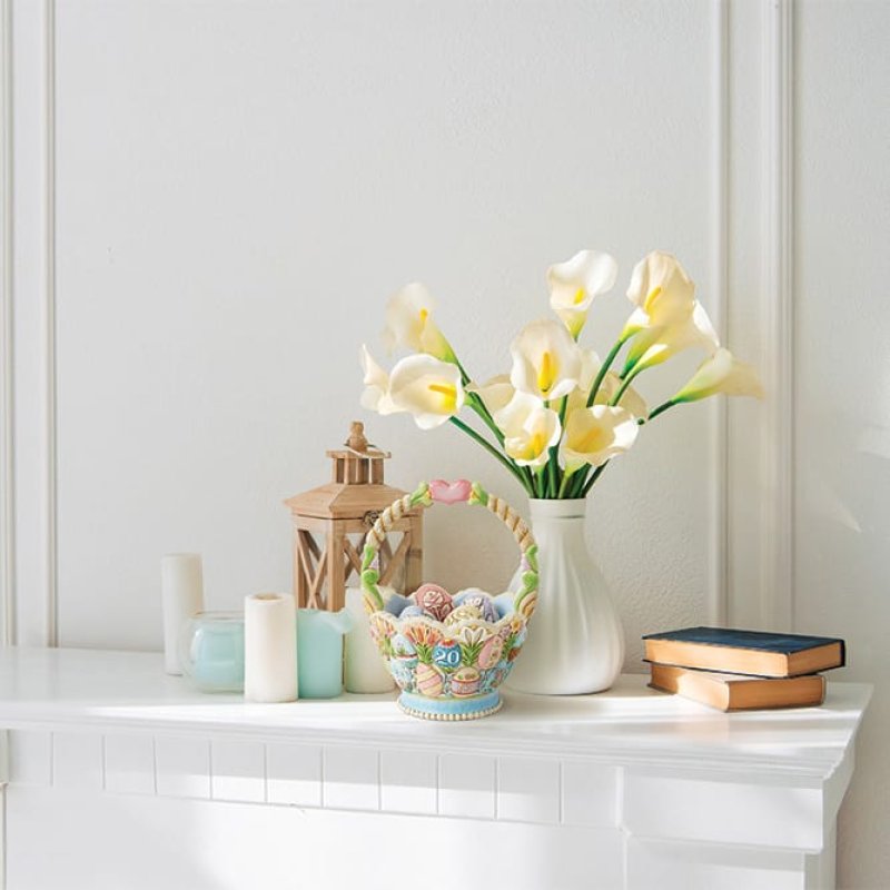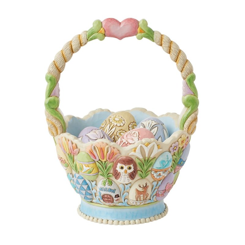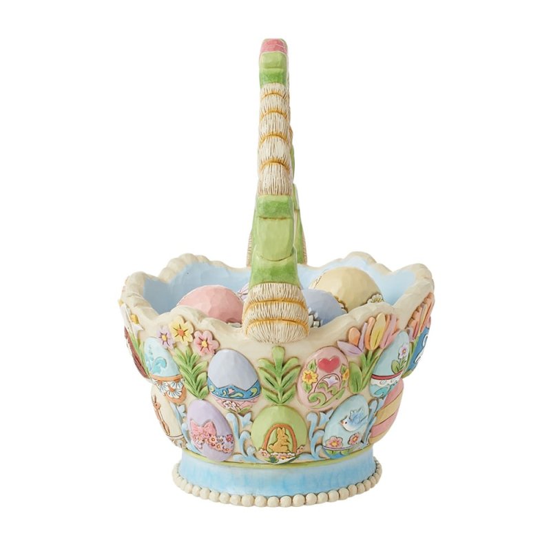 Dieser kunstvoll gestaltete Osterkorb ist die letzte Ausgabe der beliebten jährlichen Korb-Serie von Jim Shore. Mit einem filigranen Henkel, der von einem Herz geschmückt wird, und umgeben von Eierverzierungen, die an vergangene Designs erinnern, ist dieser Korb ein wahrer Hingucker. Inklusive sind vier handgefertigte Künstlereier, die das Gesamtbild perfekt abrunden.