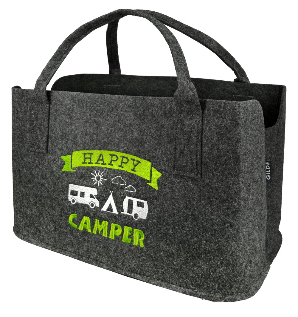 Gilde Flaschentasche „Happy Camper“ – praktisch, stilvoll und ein Must-Have für Campingfreunde - Modern, funktional und mit einem Hauch Abenteuer: Die graue Flaschentasche „Happy Camper“ mit hellgrünen Campingmotiven ist der perfekte Begleiter für Outdoor-Fans und Camper. Die Tasche bietet Platz für 6 Flaschen à 0,33L und ist ideal für Grillabende, Ausflüge oder als kreatives Geschenk für alle, die das Campen lieben. * Farbe: Grau* Material: Hochwertiger, reißfester Filz* Tragkraft: bis zu 8 kg* Waschbar bei 30° C im Schonwaschgang* Nicht bügeln, nicht für den Trockner geeignet* Stylisch & modern, passt zu jedem Outfit* Polstert empfindliche Inhalte zuverlässig* Kompakt & handlich, leicht zu transportieren* Nachhaltig, wiederverwendbar & eine tolle umweltfreundliche Geschenkidee Ob beim nächsten Camping-Trip, als Mitbringsel für die nächste Grillparty oder einfach als cooler Begleiter – die „Happy Camper“ Flaschentasche sorgt immer für gute Laune und ist ein echter Hingucker!
