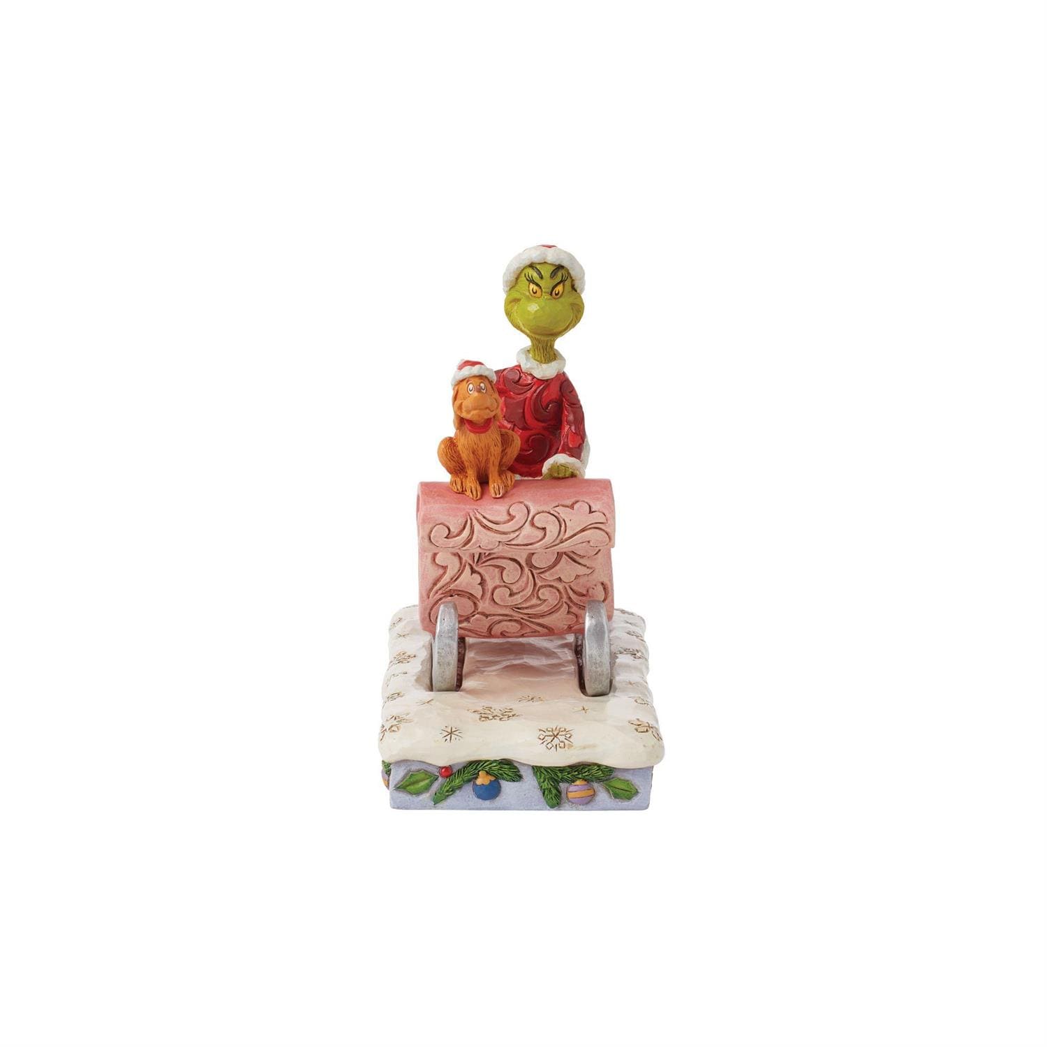 Diese bezaubernde Jim Shore Kreation zeigt den Grinch und seinen treuen Hund Max, die auf einem Schlitten durch den Schnee sausen – auf dem Weg nach Whoville, um Weihnachten zu stehlen. Der Grinch ist als Weihnachtsmann verkleidet und trägt einen großen, leeren Sack, während er mit einem bösen Plan in die festliche Nacht zieht.