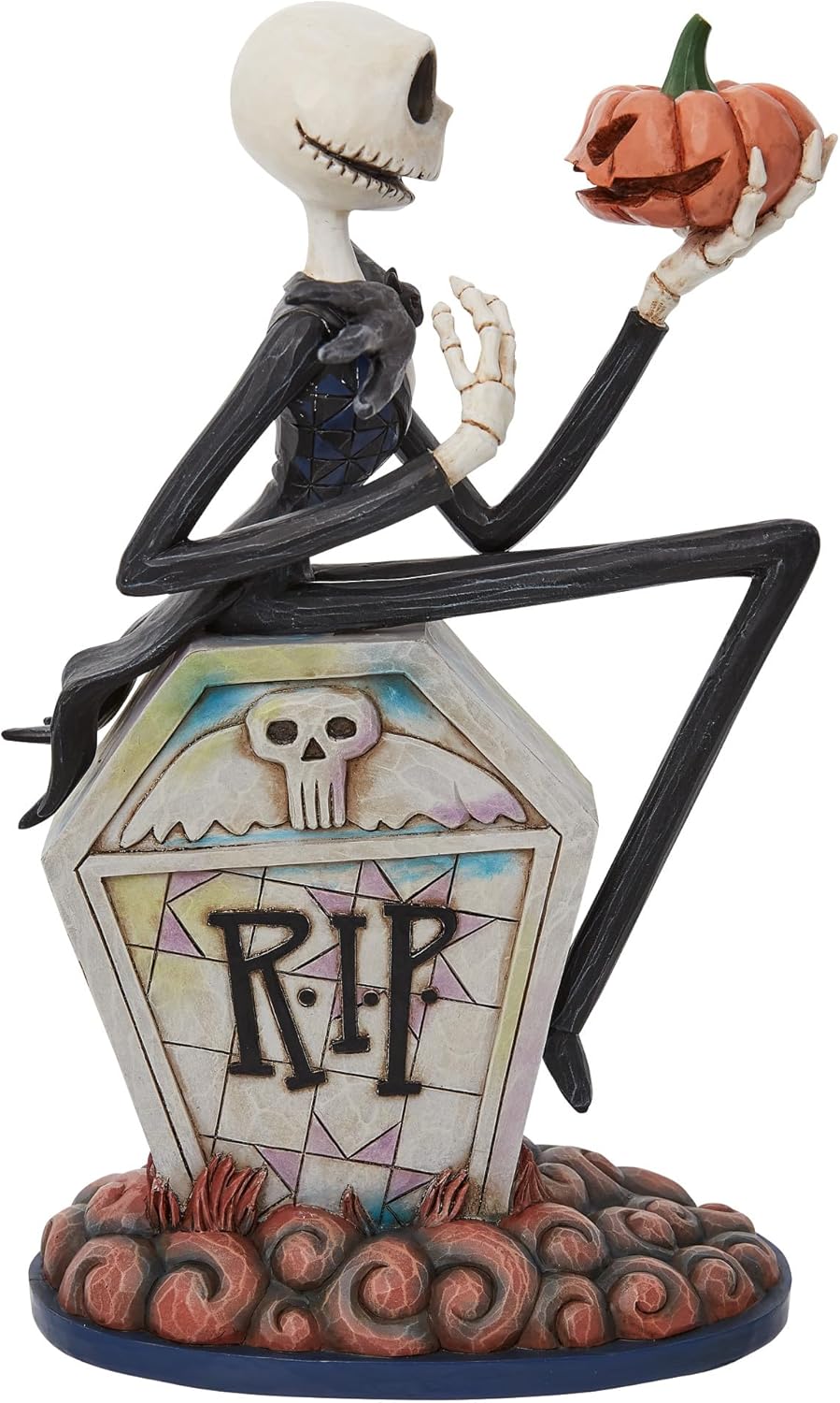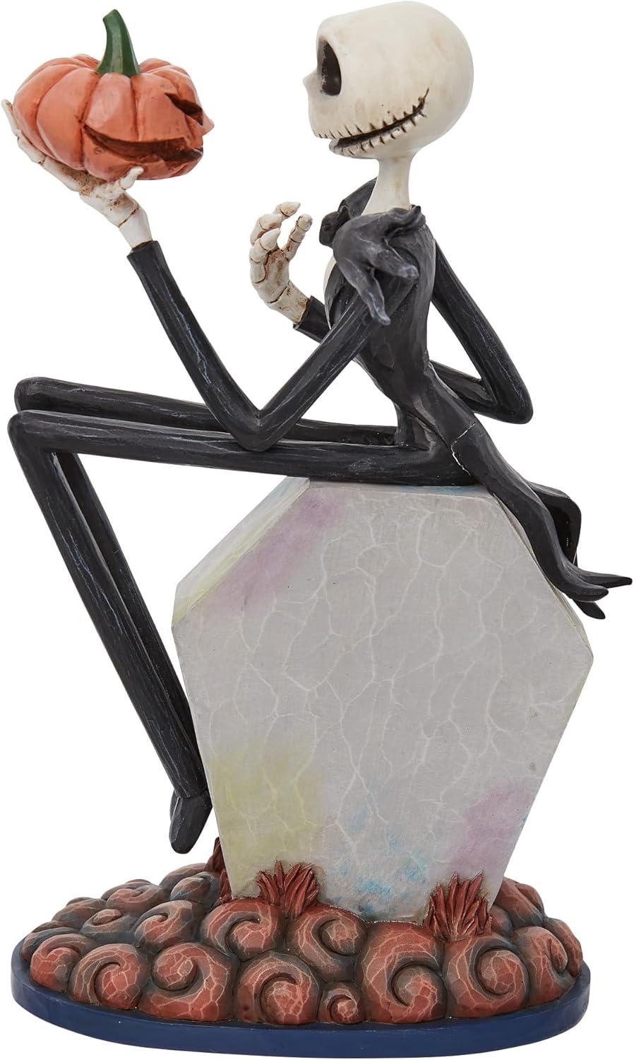 Auf einem Grabstein sitzend, hat Jack Skellington seinen ganz persönlichen "To Be or Not To Be"-Moment – und zwar mit einem Halloween-Kürbis. Auge in Auge hält er einen Kürbis, der einem Totenkopf ähnelt, und sinniert nachdenklich über Halloween und das Leben als Kürbiskönig. Dieses charmante Stück von Jim Shore fängt den melancholischen und zugleich verspielten Charakter von Jack perfekt ein.