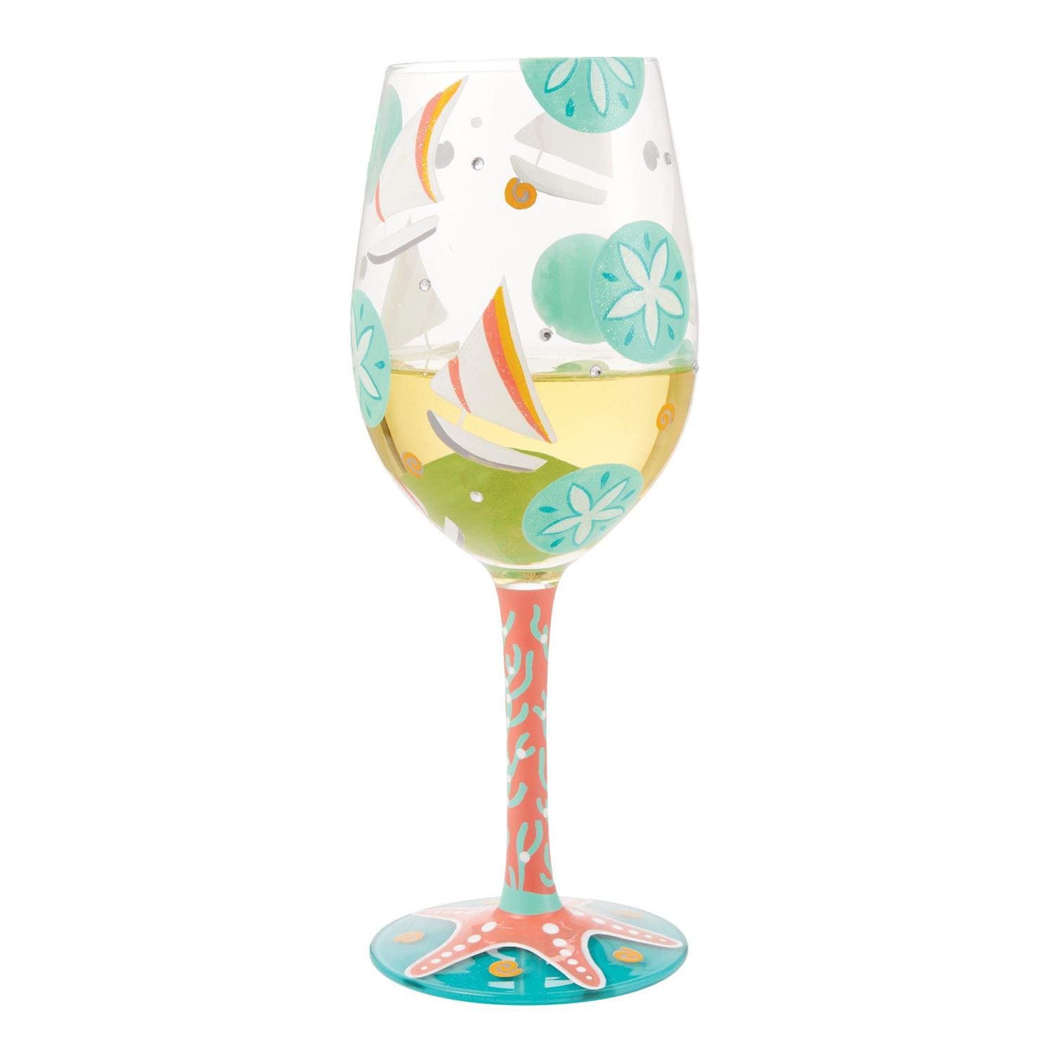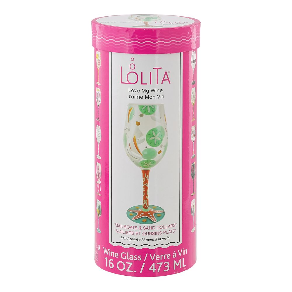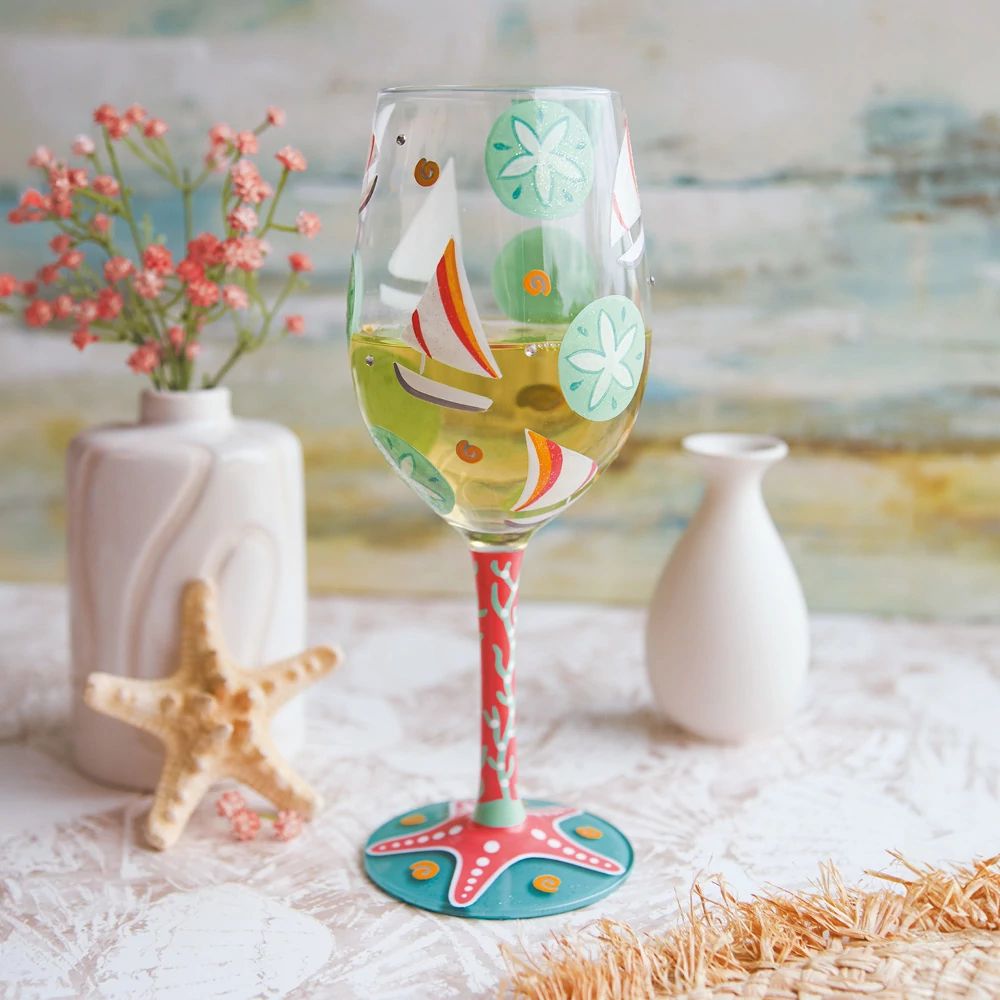 Das "Sailboats & Sand Dollars" Weinglas von Lolita ist das perfekte Accessoire für sonnige Sommertage, egal ob Sie segeln oder einfach am Strand entspannen. Mit seinem leuchtenden Blau und kräftigem Korallenrosa bringt dieses Glas die fröhliche Stimmung eines Sommertages zum Leben. Der Stiel ist mit einem handgemalten Korallen- und Seesternmotiv verziert, und auf dem Sockel befindet sich ein herrlicher meerblauer Cocktail – ideal für Ihre Lieblingsgetränke unter der Sonne.