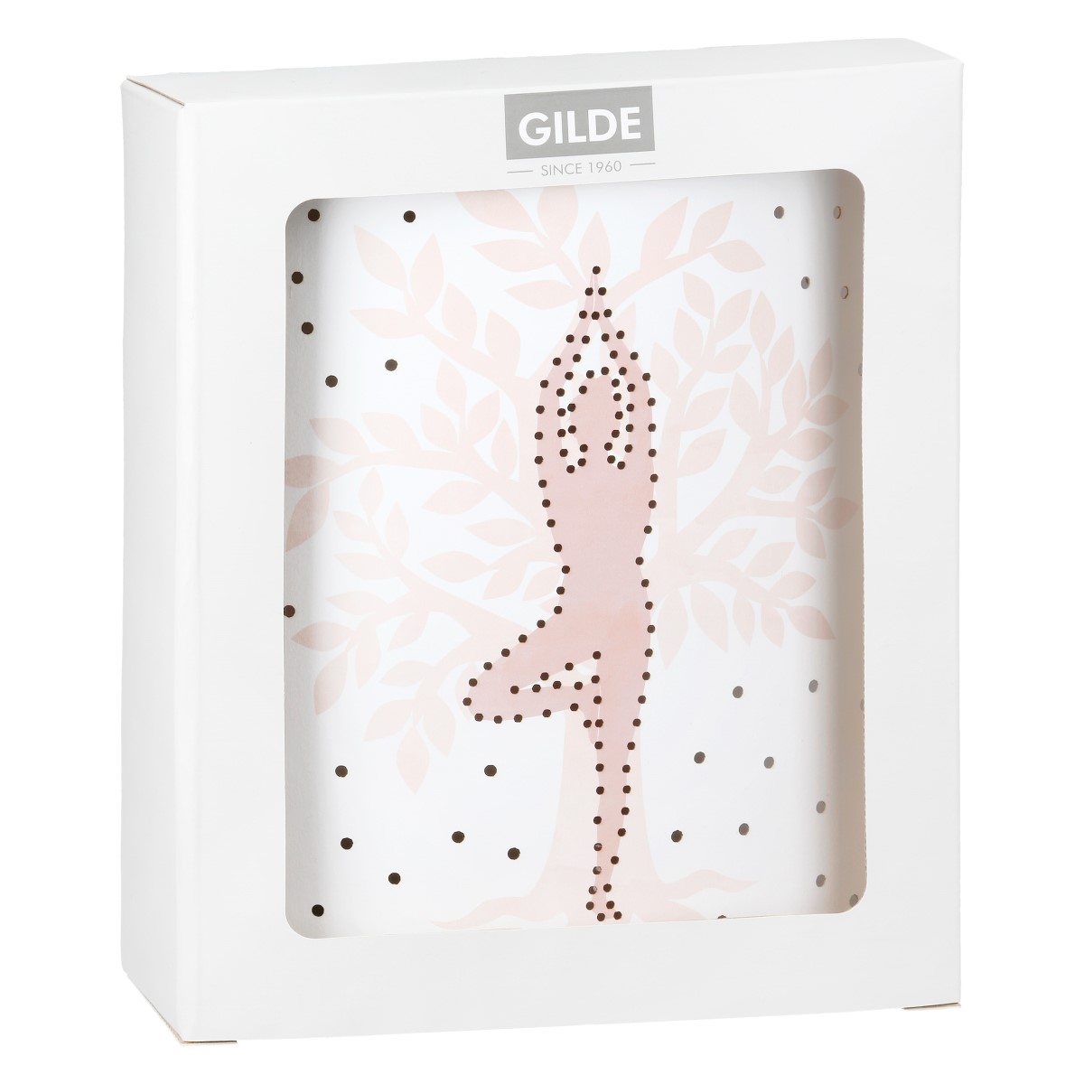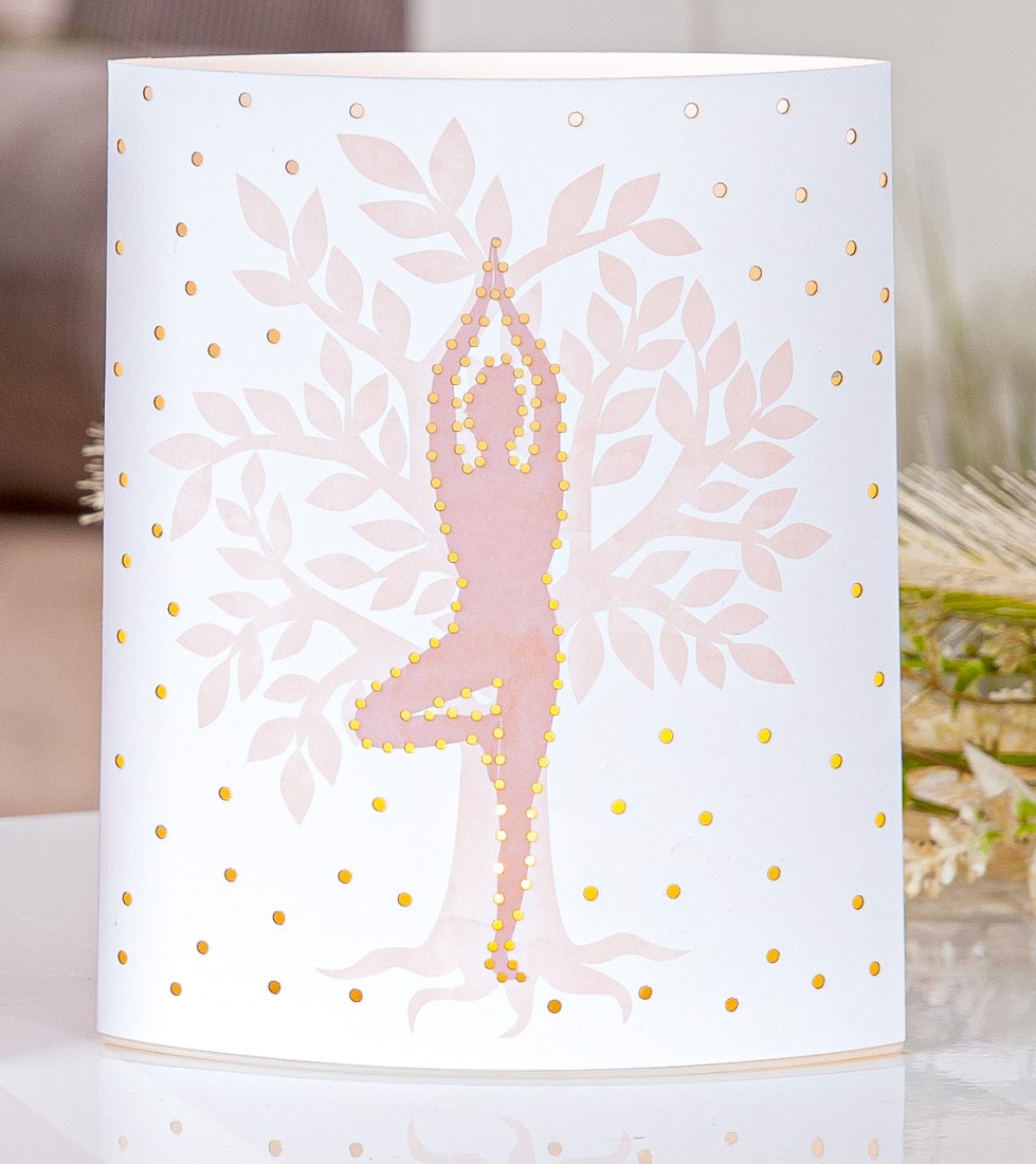 Im Mittelpunkt steht ein filigraner Baum, durch die das Licht besonders schön leuchtet. Davor steht eine Frau in typischer Yoga-Pose – ein Symbol für innere Balance, Achtsamkeit und Ruhe. Eine stilvolle Leuchte, die Körper, Geist und Raum in Einklang bringt.