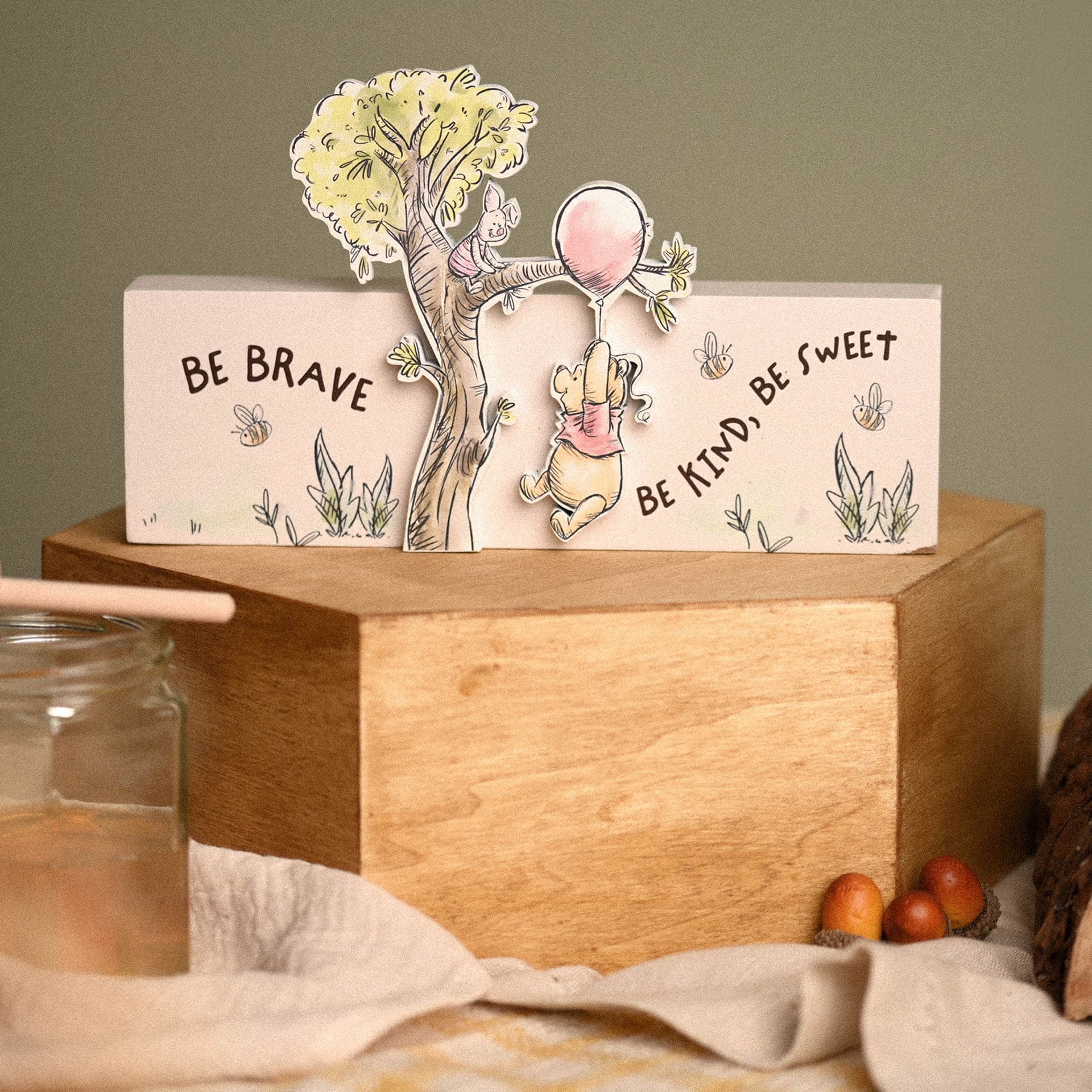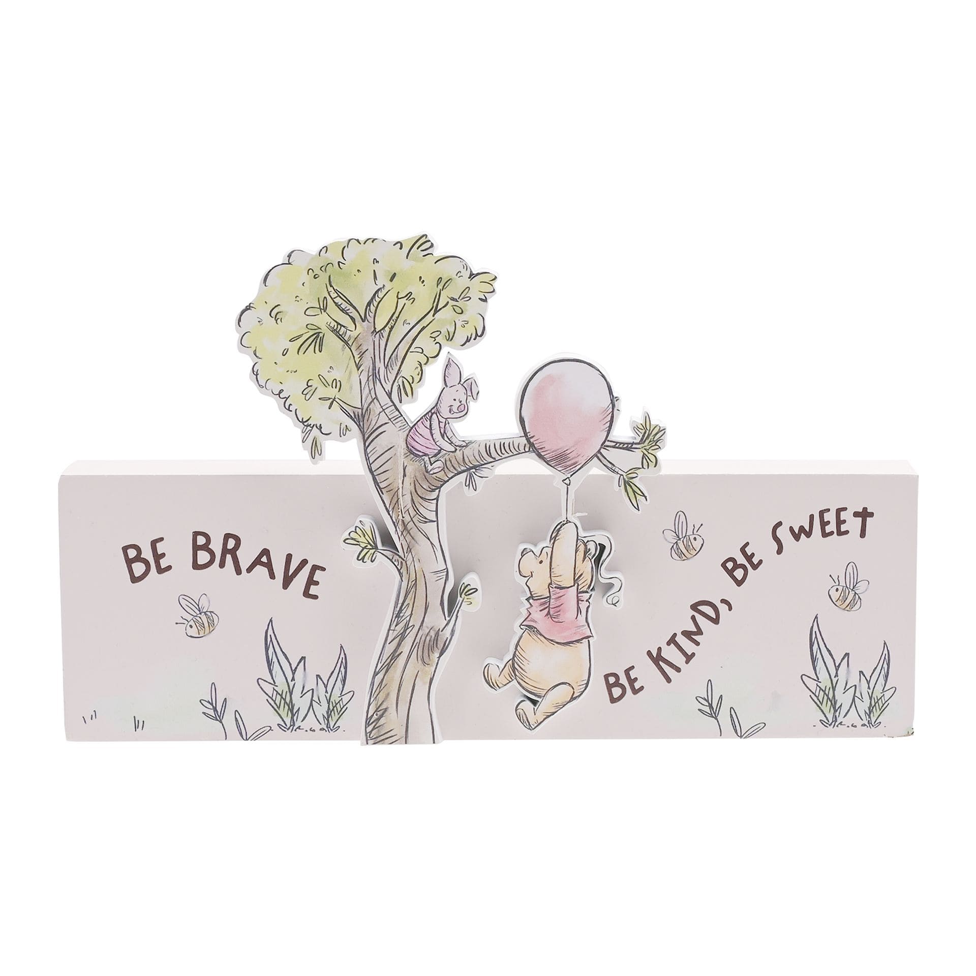 - Design: Rosafarbene Leiste mit dem inspirierenden Spruch „Be Brave, Be Kind, Be Sweet“, umrahmt von gedruckten Gartenbildern und einem 3D-Ausschnitt von Winnie Puuh und Ferkel