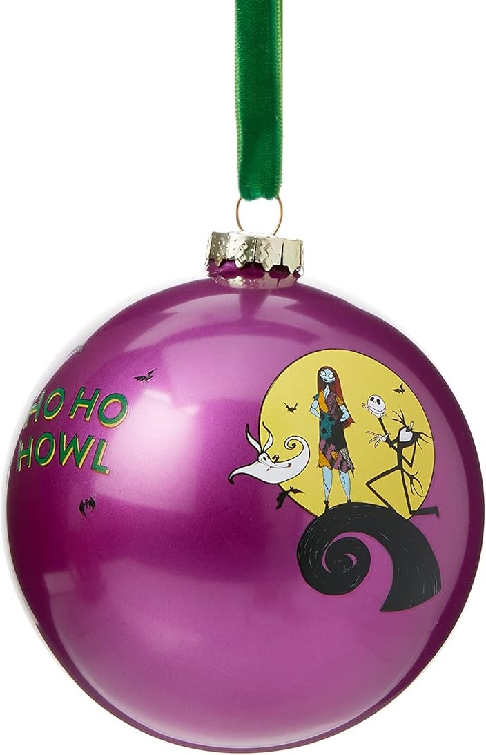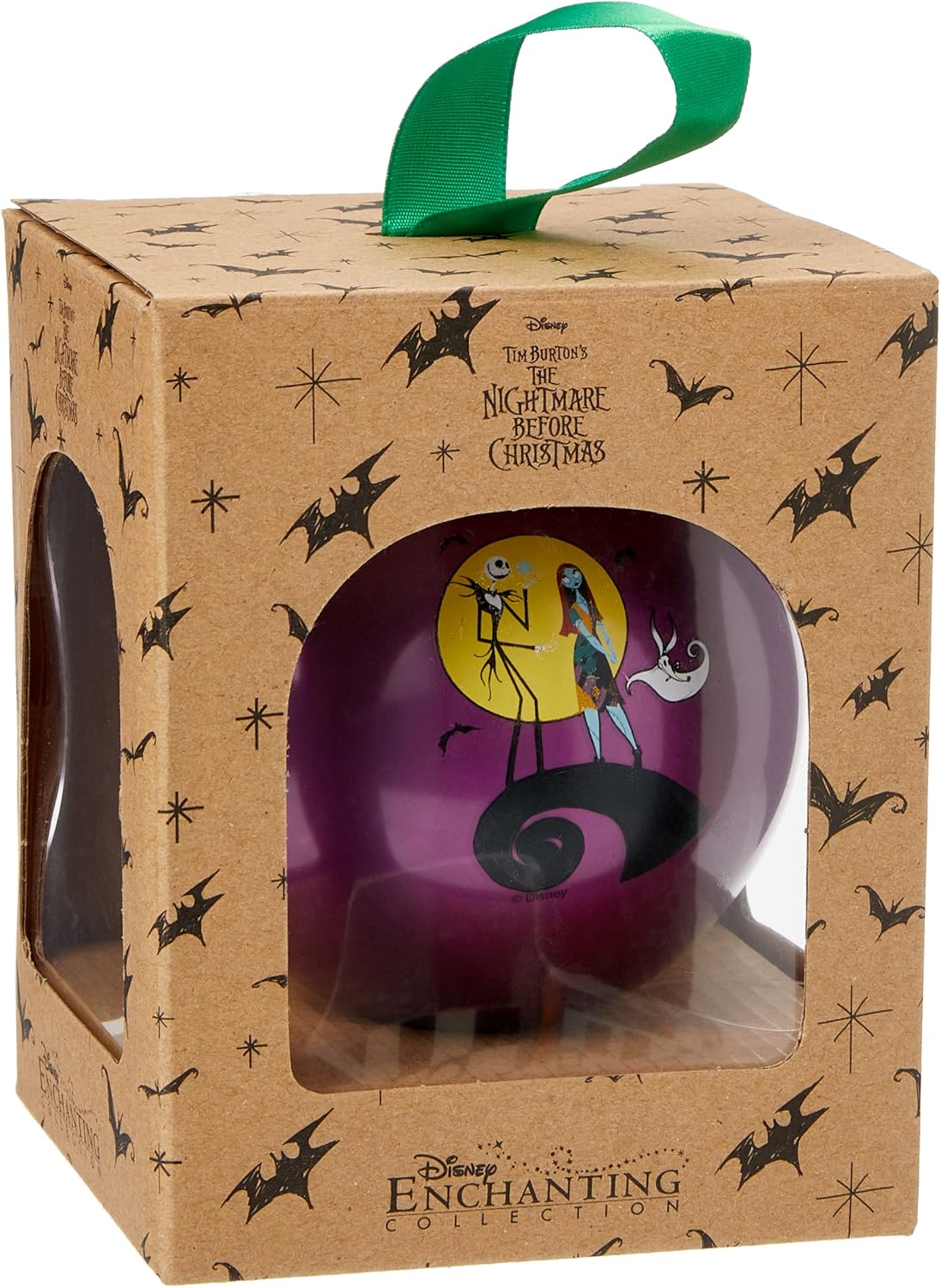 Verleihen Sie Ihrer Weihnachtsdekoration eine düstere, aber zauberhafte Note mit dieser lila Weihnachtskugel, die die legendären Charaktere Jack Skellington und Sally aus The Nightmare Before Christmas zeigt. Inmitten des magischen Zaubers von Halloween Town strahlt ihre Verbindung zueinander – ein Symbol für Liebe und Abenteuer in einer Welt voller Wunder.