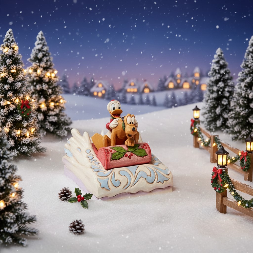 Dieses Paar bereitet sich auf eine Hochgeschwindigkeitsfahrt den Weihnachtsberg hinunter vor. Donald hält sich an Pluto fest, um ihn zu stützen, während ihr Schlitten in dieser Figur im Jim Shore-Design durch die verschneite Landschaft fährt. Mit Freunden wie diesen ist der Winter einfach wärmer. Die Figur ist handbemalt und handgeformt aus hochwertigem Kunstharz, was ihr eine besondere Detailtreue verleiht.