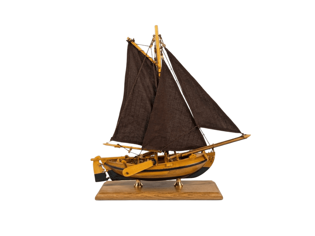 - Handgefertigt: Holzrumpf, Segelstoff, Messingdetails