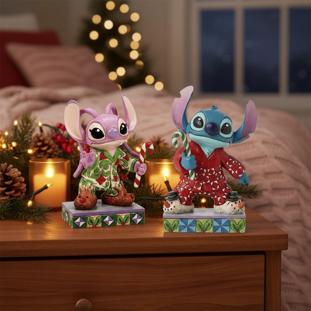 Dieses süße Design von Jim Shore zeigt Stitch im festlichen Feiertags-Schlafanzug. Der blaue Außerirdische trägt einen roten Patchwork-Pyjama und Schneemann-Pantoffeln, während er lächelnd eine Zuckerstange hält. Die detailreiche Gestaltung fängt die fröhliche Stimmung der Weihnachtszeit perfekt ein.