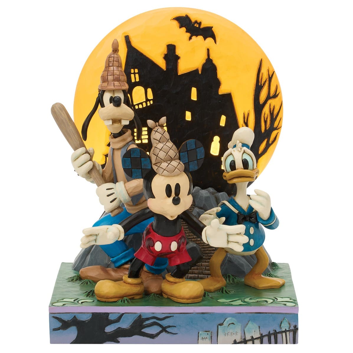 „Look Out! Ghosts!“ aus der Disney Traditions Kollektion von Jim Shore zeigt Mickey, Goofy und Donald mit erschrockenen Gesichtsausdrücken, während sie in einem gruseligen Abenteuer gegen Geister antreten. Goofy hält dabei einen Baseballschläger, und ein leuchtender LED-Mond sorgt für eine noch gespenstischere Atmosphäre. Diese handbemalte Figur kombiniert den Humor der beliebten Disney-Charaktere mit der magischen, spooky Atmosphäre von Halloween.