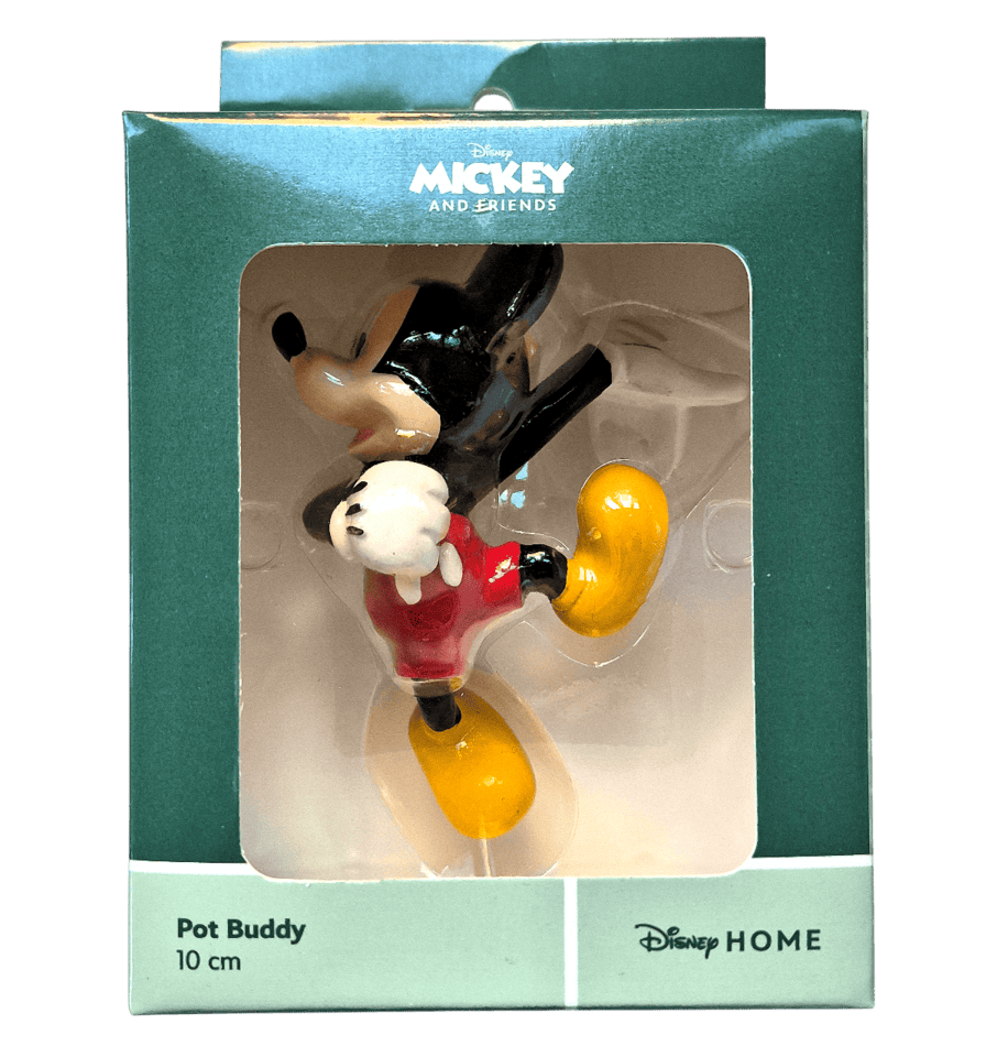 Dieser charmante Pot Buddy zeigt Micky Maus in einer fröhlichen Kletterpose: Mit einem Lächeln im Gesicht hängt er seitlich am Rand eines Blumentopfes und scheint jeden Moment „Hallo“ sagen zu wollen. Sein klassisches Outfit – rote Hose, gelbe Schuhe und weiße Handschuhe – macht ihn sofort als echten Disney-Klassiker erkennbar. Der ca. 8 cm große Topfanhänger aus wetterfestem Polyresin ist handbemalt und begeistert mit liebevollen Details. Einfach an den Rand eines Topfes, einer Vase oder eines Regals hängen – drinnen oder draußen sorgt Micky garantiert für gute Laune. Ein zauberhaftes Geschenk für Disney-Fans, Pflanzenfreunde oder als kleine Aufmerksamkeit mit großem Charme.