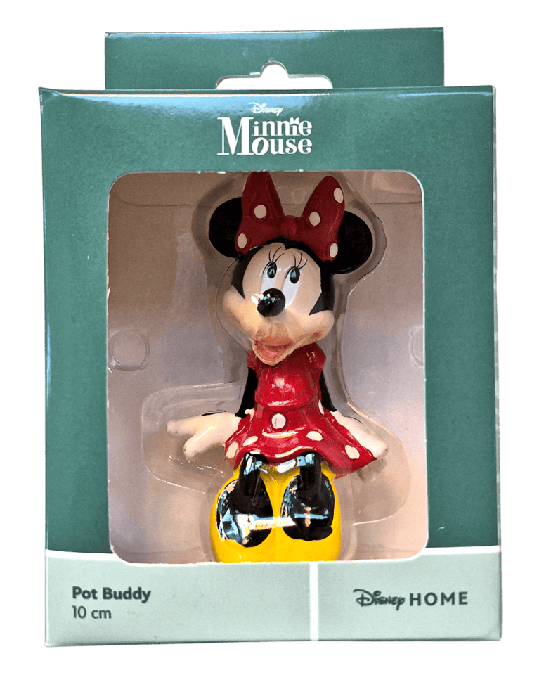 Dieser detailreich gestaltete Pot Buddy zeigt Minnie Maus, wie sie charmant am Rand eines Blumentopfes Platz nimmt – ganz in ihrem klassischen Look mit rot-weiß gepunktetem Kleid und passender roter Schleife. Mit ihren zarten Beinchen baumelnd bringt sie nicht nur gute Laune, sondern auch einen Hauch Disney-Zauber in dein Zuhause oder deinen Garten. Der ca. 8 cm große Topfanhänger aus wetterfestem Polyresin ist handbemalt und eignet sich ideal für Blumentöpfe, Vasen oder schmale Regalkanten – drinnen wie draußen. Einfach an den Rand hängen – kein Kleben oder Befestigen nötig. Ein liebevolles Geschenk für Disney-Fans, Pflanzenfreunde oder als kleine Aufmerksamkeit mit großer Wirkung.
