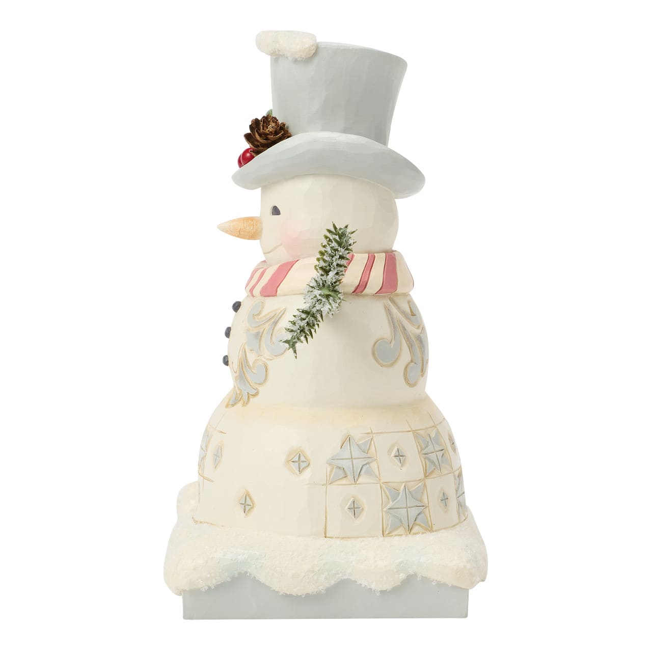 Der preisgekrönte Künstler Jim Shore vereint in diesem Design erneut das Beste aus der traditionellen Volkskunst. Mit den charakteristischen Quilt-Mustern und Texturen, die an handgeschnitztes Holz erinnern, weckt dieser Schneemann ein Gefühl von Nostalgie und Geborgenheit. Jedes Detail wurde sorgfältig entworfen, um die Harmonie zwischen festlicher Tradition und der rauen Eleganz des Waldes einzufangen.