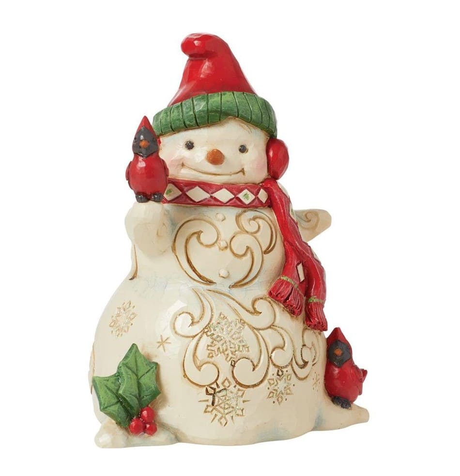 Feiern Sie die Weihnachtszeit mit diesem charmanten Mini Schneemann, der seine geflügelten Freunde in den Mittelpunkt stellt. Dieser freundliche Schneemann trägt ein Vogelnest als Krone und strahlt pure Festlichkeit aus. Mit einem Kardinal in der Hand und zwei weiteren Kardinälen in seinem Hut vermittelt er die Freude und den Zauber der Feiertage, die er zusammen mit der Natur und seinen kleinen Vogelgefährten genießt.Mini Schneemann mit Kardinalsnest auf dem Kopf, einem Kardinal in der Hand und zwei weiteren Kardinälen im Hut.Handbemalt mit filigranen Details, die den Jim Shore Stil und die festliche Stimmung perfekt zur Geltung bringen.Charmantes Design, das die Natur und die Freude der Feiertage miteinander vereint.Verleihen Sie Ihrer Dekoration eine süße und festliche Note mit diesem Mini Schneemann und seinen Kardinälen – der perfekte Begleiter für eine winterliche Weihnachtszeit!